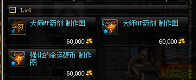 三级的时候,可以去做四级的大师MP或者HP药剂,这个东西拍卖行也可以甩出去的,不算冷门,之所以不去做别的药水是因为一些药水的成本非常高,失败了可以得到的收益更少,比如透明 霸体复活这些非常贵的药水。