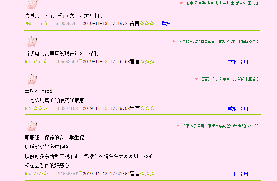 当时看觉得虐,现在发现三观特别不正,男主莫绍谦难道不是强占女主童雪还监禁她么,这难道不足以被批得体无完肤,更该被送进大牢。
