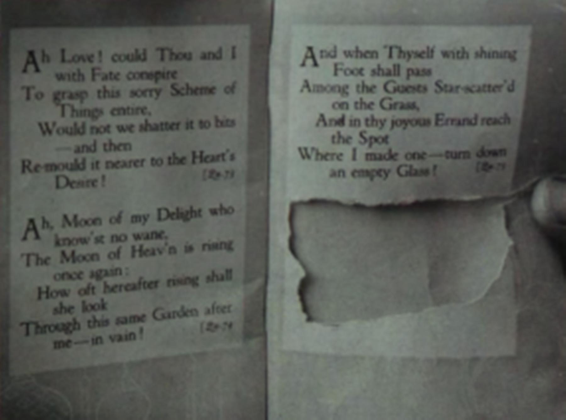 根据图书馆专家的辨认,这两个单词来自于古波斯诗人莪默·伽亚谟所作的长诗《鲁拜集》的最后一页,意思是“结束”。